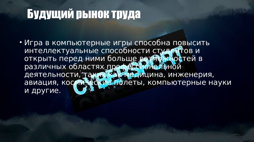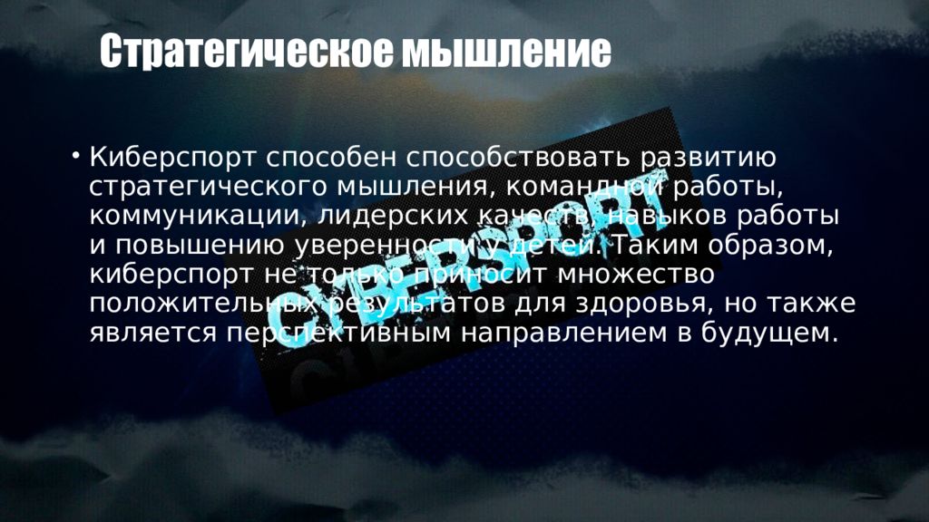 Киберспорт способен способствовать развитию стратегического мышления, командной работы, коммуникации, лидерских качеств, навыков работы и повышению уверенности у детей. Таким образом, киберспорт не только приносит множество положительных результатов для здоровья, но также является перспективным направлением в будущем.