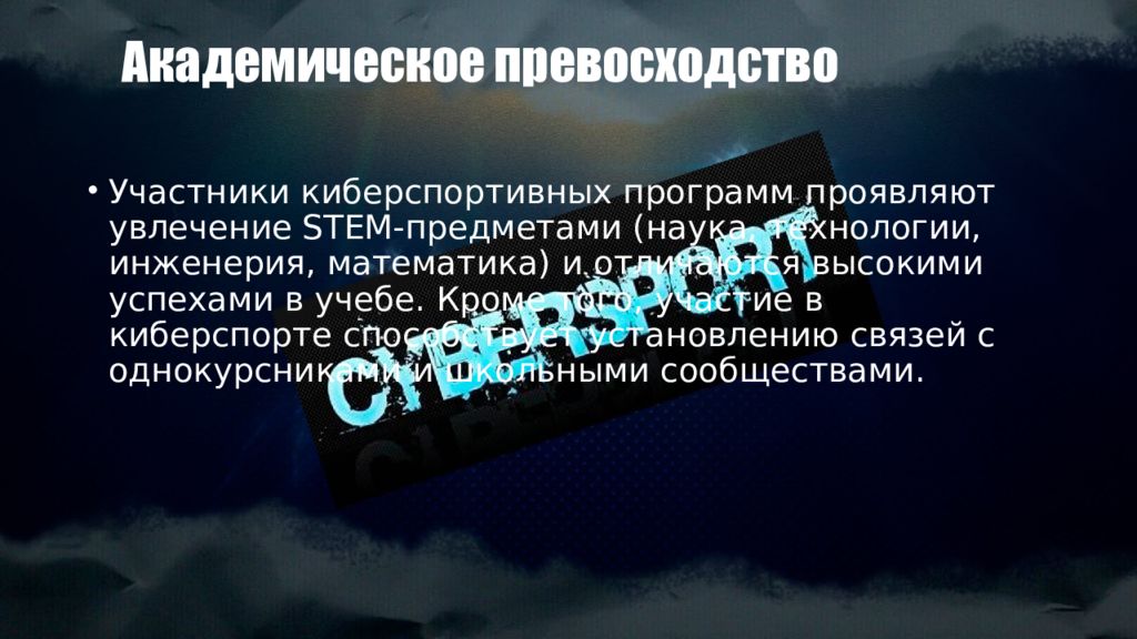 Участники киберспортивных программ проявляют увлечение STEM-предметами (наука, технологии, инженерия, математика) и отличаются высокими успехами в учебе. Кроме того, участие в киберспорте способствует установлению связей с однокурсниками и школьными сообществами.