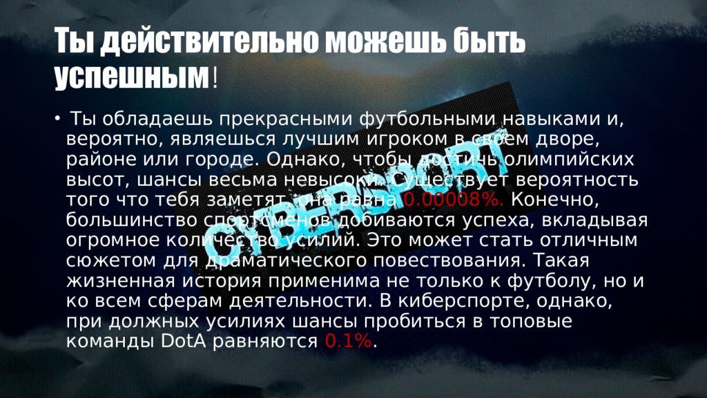 Ты обладаешь прекрасными футбольными навыками и, вероятно, являешься лучшим игроком в своем дворе, районе или городе. Однако, чтобы достичь олимпийских высот, шансы весьма невысоки. Существует вероятность того что тебя заметят, она равна 0.00008%. Конечно, большинство спортсменов добиваются успеха, вкладывая огромное количество усилий. Это может стать отличным сюжетом для драматического повествования. Такая жизненная история применима не только к футболу, но и ко всем сферам деятельности. В киберспорте, однако, при должных усилиях шансы пробиться в топовые команды DotA равняются 0. 1 %.