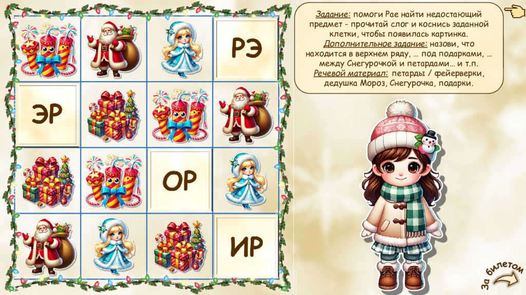 Задание: помоги Рае найти недостающий предмет - прочитай слог и коснись заданной клетки, чтобы появилась картинка. Дополнительное задание: назови, что находится в верхнем ряду, … под подарками, …между Снегурочкой и петардами… и т.п. Речевой материал: петарды / фейерверки, дедушка Мороз, Снегурочка, подарки.