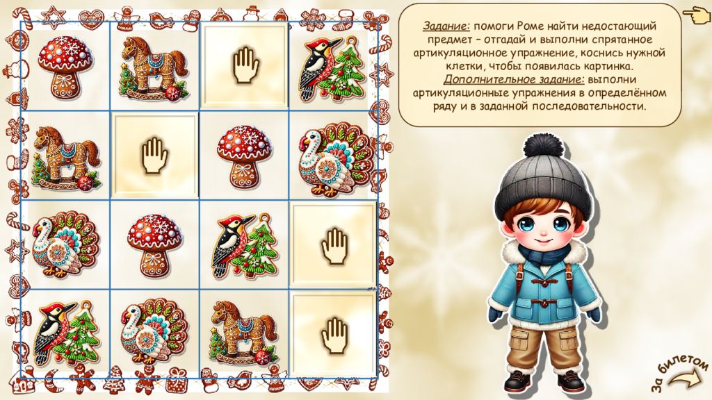 Задание: помоги Роме найти недостающий предмет – отгадай и выполни спрятанное артикуляционное упражнение, коснись нужной клетки, чтобы появилась картинка. Дополнительное задание: выполни артикуляционные упражнения в определённом ряду и в заданной последовательности.