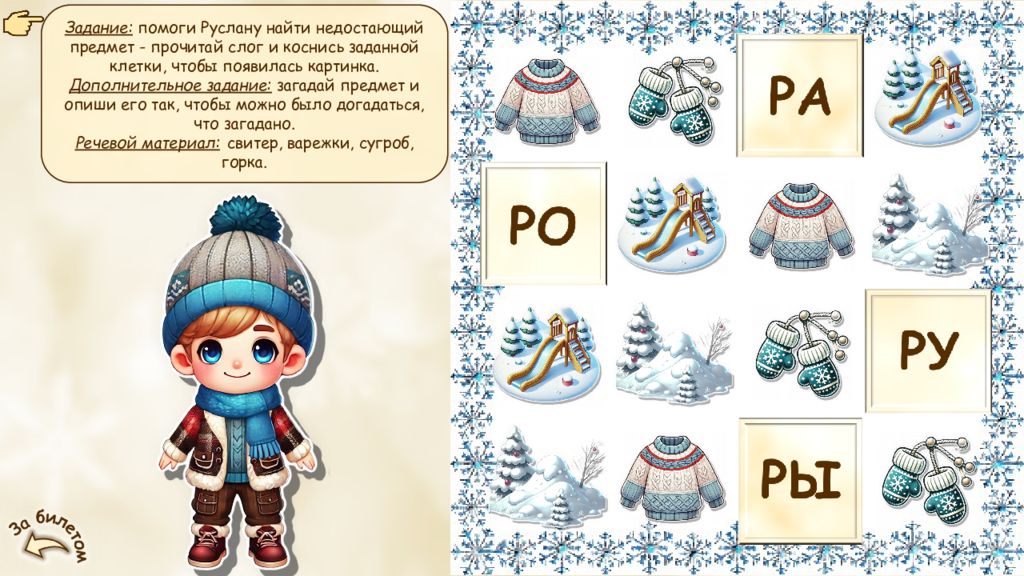 Задание: помоги Руслану найти недостающий предмет - прочитай слог и коснись заданной клетки, чтобы появилась картинка. Дополнительное задание: загадай предмет и опиши его так, чтобы можно было догадаться, что загадано. Речевой материал: свитер, варежки, сугроб, горка.