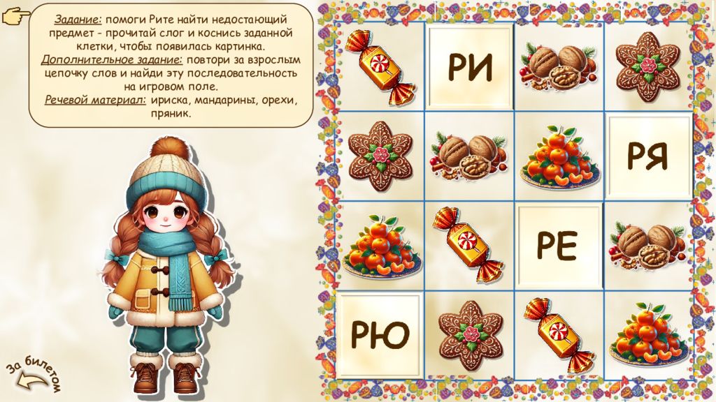 Задание: помоги Рите найти недостающий предмет - прочитай слог и коснись заданной клетки, чтобы появилась картинка. Дополнительное задание: повтори за взрослым цепочку слов и найди эту последовательность на игровом поле. Речевой материал: ириска, мандарины, орехи, пряник.