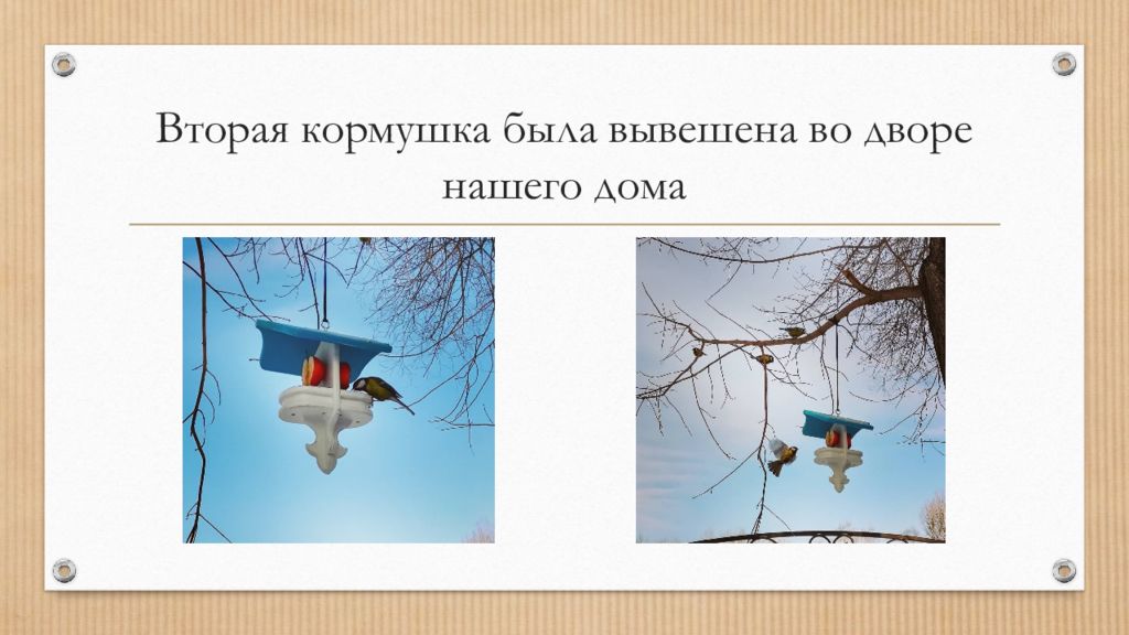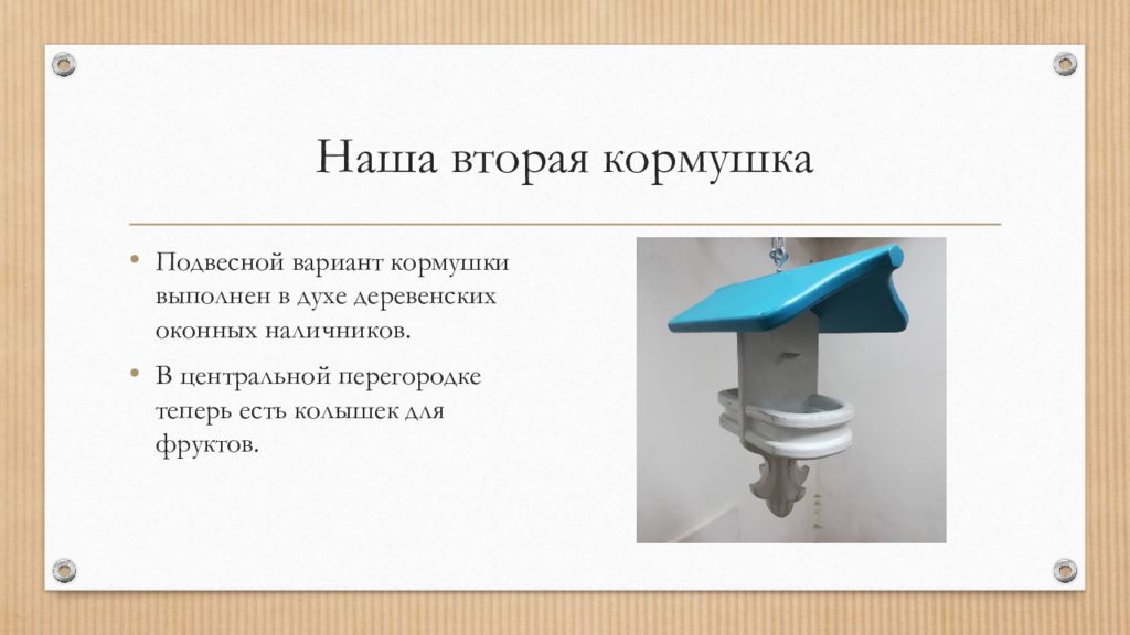 Подвесной вариант кормушки выполнен в духе деревенских оконных наличников. В центральной перегородке теперь есть колышек для фруктов.