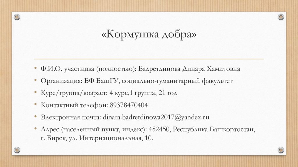 Ф.И.О. участника (полностью): Бадретдинова Динара Хамитовна Организация: БФ БашГУ, социально-гуманитарный факультет Курс/группа/возраст: 4 курс,1 группа, 21 год Контактный телефон: 89378470404 Электронная почта: dinara.badretdinowa2017@yandex.ru Адрес (населенный пункт, индекс): 452450, Республика Башкортостан, г. Бирск, ул. Интернациональная, 10.