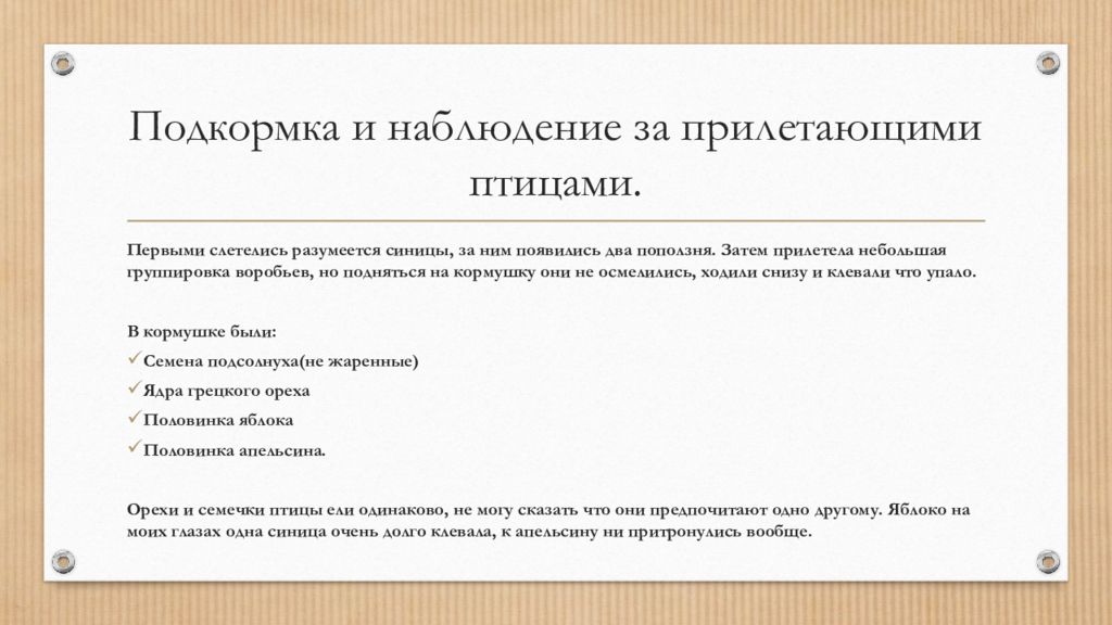 Первыми слетелись разумеется синицы, за ним появились два поползня. Затем прилетела небольшая группировка воробьев, но подняться на кормушку они не осмелились, ходили снизу и клевали что упало. В кормушке были: Семена подсолнуха(не жаренные) Ядра грецкого ореха Половинка яблока Половинка апельсина. Орехи и семечки птицы ели одинаково, не могу сказать что они предпочитают одно другому. Яблоко на моих глазах одна синица очень долго клевала, к апельсину ни притронулись вообще.