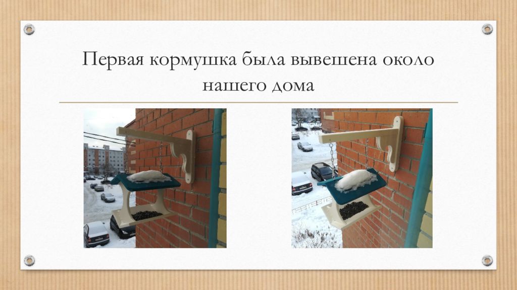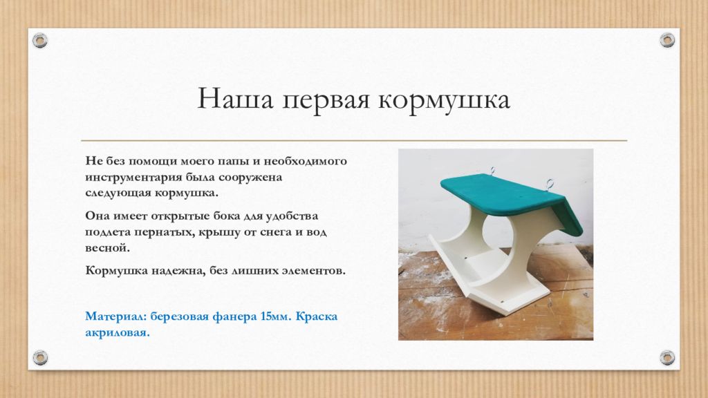 Не без помощи моего папы и необходимого инструментария была сооружена следующая кормушка. Она имеет открытые бока для удобства подлета пернатых, крышу от снега и вод весной. Кормушка надежна, без лишних элементов. Материал: березовая фанера 15мм. Краска акриловая.