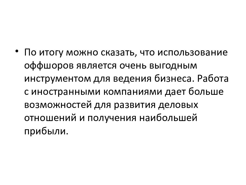 По итогу можно сказать, что использование оффшоров является очень выгодным инструментом для ведения бизнеса. Работа с иностранными компаниями дает больше возможностей для развития деловых отношений и получения наибольшей прибыли.