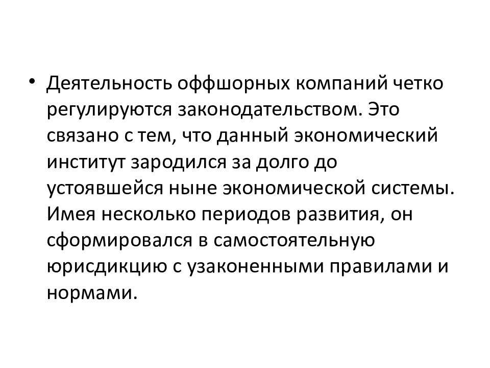 Деятельность оффшорных компаний четко регулируются законодательством. Это связано с тем, что данный экономический институт зародился за долго до устоявшейся ныне экономической системы. Имея несколько периодов развития, он сформировался в самостоятельную юрисдикцию с узаконенными правилами и нормами.
