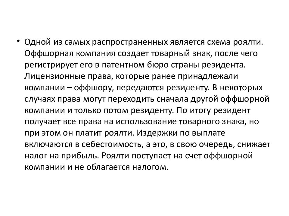 Одной из самых распространенных является схема роялти. Оффшорная компания создает товарный знак, после чего регистрирует его в патентном бюро страны резидента. Лицензионные права, которые ранее принадлежали компании – оффшору, передаются резиденту. В некоторых случаях права могут переходить сначала другой оффшорной компании и только потом резиденту. По итогу резидент получает все права на использование товарного знака, но при этом он платит роялти. Издержки по выплате включаются в себестоимость, а это, в свою очередь, снижает налог на прибыль. Роялти поступает на счет оффшорной компании и не облагается налогом.
