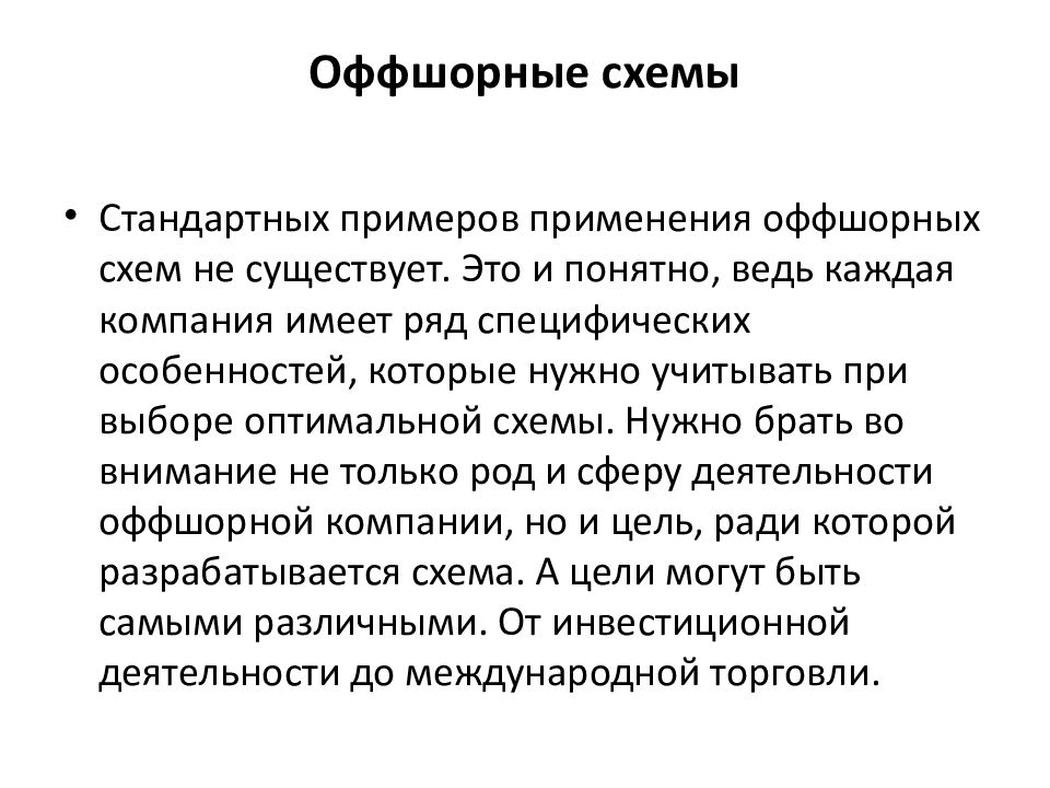Стандартных примеров применения оффшорных схем не существует. Это и понятно, ведь каждая компания имеет ряд специфических особенностей, которые нужно учитывать при выборе оптимальной схемы. Нужно брать во внимание не только род и сферу деятельности оффшорной компании, но и цель, ради которой разрабатывается схема. А цели могут быть самыми различными. От инвестиционной деятельности до международной торговли.