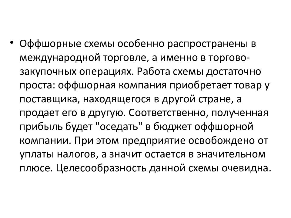 Оффшорные схемы особенно распространены в международной торговле, а именно в торгово-закупочных операциях. Работа схемы достаточно проста: оффшорная компания приобретает товар у поставщика, находящегося в другой стране, а продает его в другую. Соответственно, полученная прибыль будет "оседать" в бюджет оффшорной компании. При этом предприятие освобождено от уплаты налогов, а значит остается в значительном плюсе. Целесообразность данной схемы очевидна.