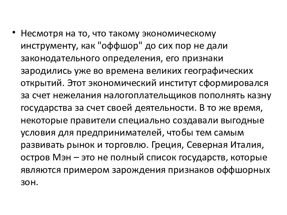 Несмотря на то, что такому экономическому инструменту, как "оффшор" до сих пор не дали законодательного определения, его признаки зародились уже во времена великих географических открытий. Этот экономический институт сформировался за счет нежелания налогоплательщиков пополнять казну государства за счет своей деятельности. В то же время, некоторые правители специально создавали выгодные условия для предпринимателей, чтобы тем самым развивать рынок и торговлю. Греция, Северная Италия, остров Мэн – это не полный список государств, которые являются примером зарождения признаков оффшорных зон.