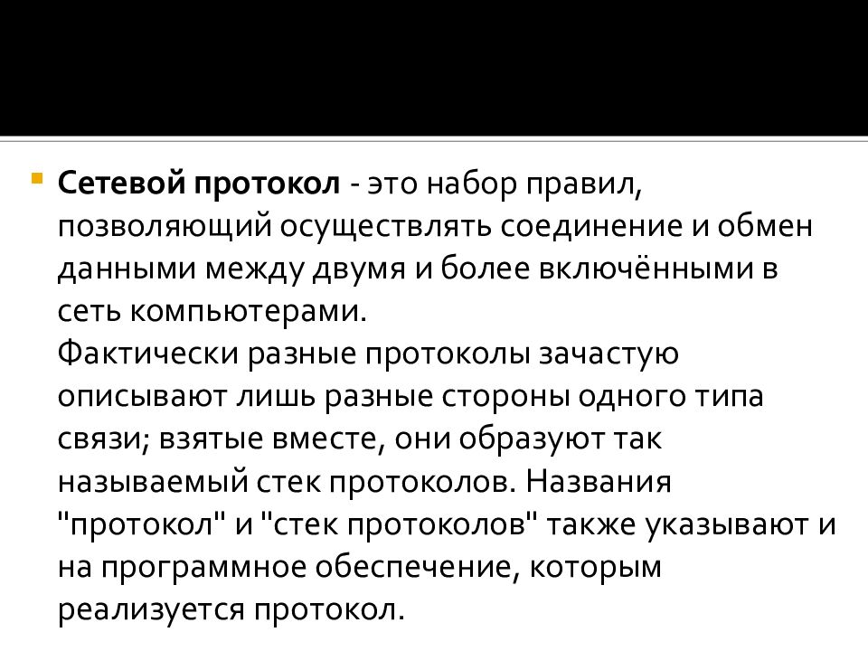 Сетевой протокол - это набор правил, позволяющий осуществлять соединение и обмен данными между двумя и более включёнными в сеть компьютерами. Фактически разные протоколы зачастую описывают лишь разные стороны одного типа связи; взятые вместе, они образуют так называемый стек протоколов. Названия "протокол" и "стек протоколов" также указывают и на программное обеспечение, которым реализуется протокол.