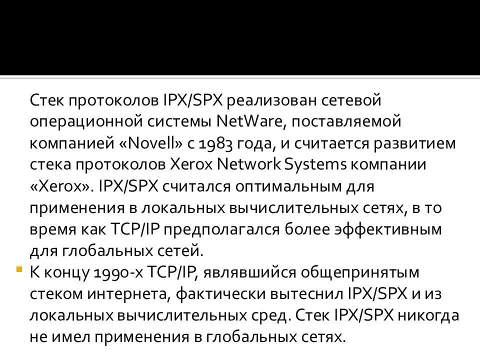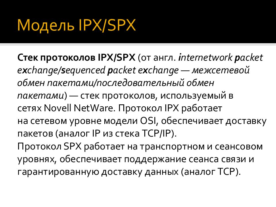 Стек протоколов IPX/SPX (от англ. i nternetwork p acket e x change / s equenced p acket e x change — межсетевой обмен пакетами/последовательный обмен пакетами ) — стек протоколов, используемый в сетях Novell NetWare. Протокол IPX работает на сетевом уровне модели OSI, обеспечивает доставку пакетов (аналог IP из стека TCP/IP). Протокол SPX работает на транспортном и сеансовом уровнях, обеспечивает поддержание сеанса связи и гарантированную доставку данных (аналог TCP).