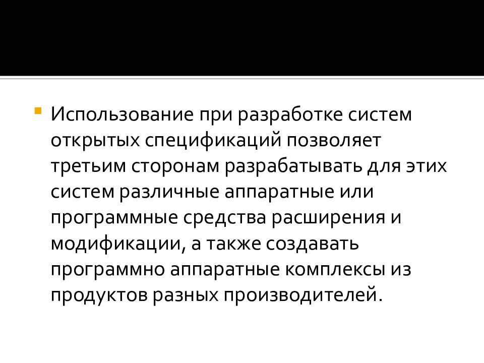 Использование при разработке систем открытых спецификаций позволяет третьим сторонам разрабатывать для этих систем различные аппаратные или программные средства расширения и модификации, а также создавать программно аппаратные комплексы из продуктов разных производителей.