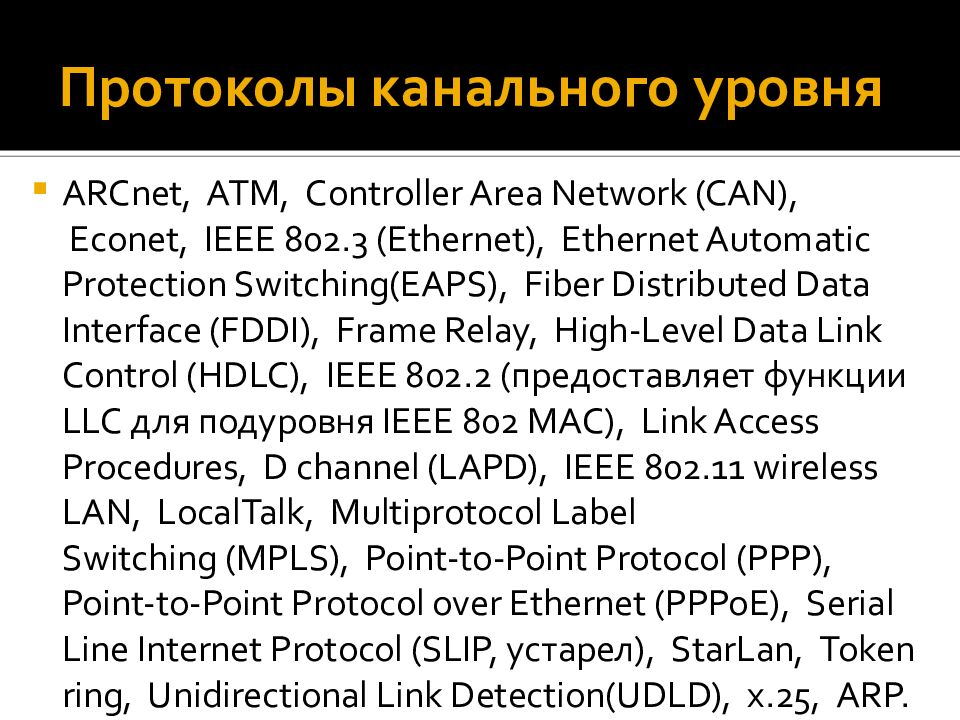 ARCnet, ATM, Controller Area Network (CAN), Econet, IEEE 802.3 (Ethernet), Ethernet Automatic Protection Switching(EAPS), Fiber Distributed Data Interface (FDDI), Frame Relay, High-Level Data Link Control (HDLC), IEEE 802.2 ( предоставляет функции LLC для подуровня IEEE 802 MAC), Link Access Procedures, D channel (LAPD), IEEE 802.11 wireless LAN, LocalTalk, Multiprotocol Label Switching (MPLS), Point-to-Point Protocol (PPP), Point-to-Point Protocol over Ethernet ( PPPoE ), Serial Line Internet Protocol (SLIP, устарел), StarLan, Token ring, Unidirectional Link Detection(UDLD), x.25, ARP.