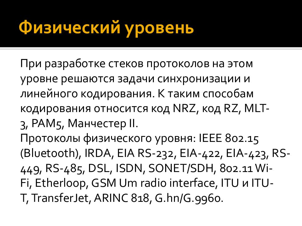 При разработке стеков протоколов на этом уровне решаются задачи синхронизации и линейного кодирования. К таким способам кодирования относится код NRZ, код RZ, MLT-3, PAM5, Манчестер II. Протоколы физического уровня: IEEE 802.15 (Bluetooth), IRDA, EIA RS-232, EIA-422, EIA-423, RS-449, RS-485, DSL, ISDN, SONET/SDH, 802.11 Wi-Fi, Etherloop, GSM Um radio interface, ITU и ITU-T, TransferJet, ARINC 818, G.hn/G.9960.