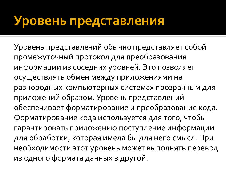 Уровень представлений обычно представляет собой промежуточный протокол для преобразования информации из соседних уровней. Это позволяет осуществлять обмен между приложениями на разнородных компьютерных системах прозрачным для приложений образом. Уровень представлений обеспечивает форматирование и преобразование кода. Форматирование кода используется для того, чтобы гарантировать приложению поступление информации для обработки, которая имела бы для него смысл. При необходимости этот уровень может выполнять перевод из одного формата данных в другой.