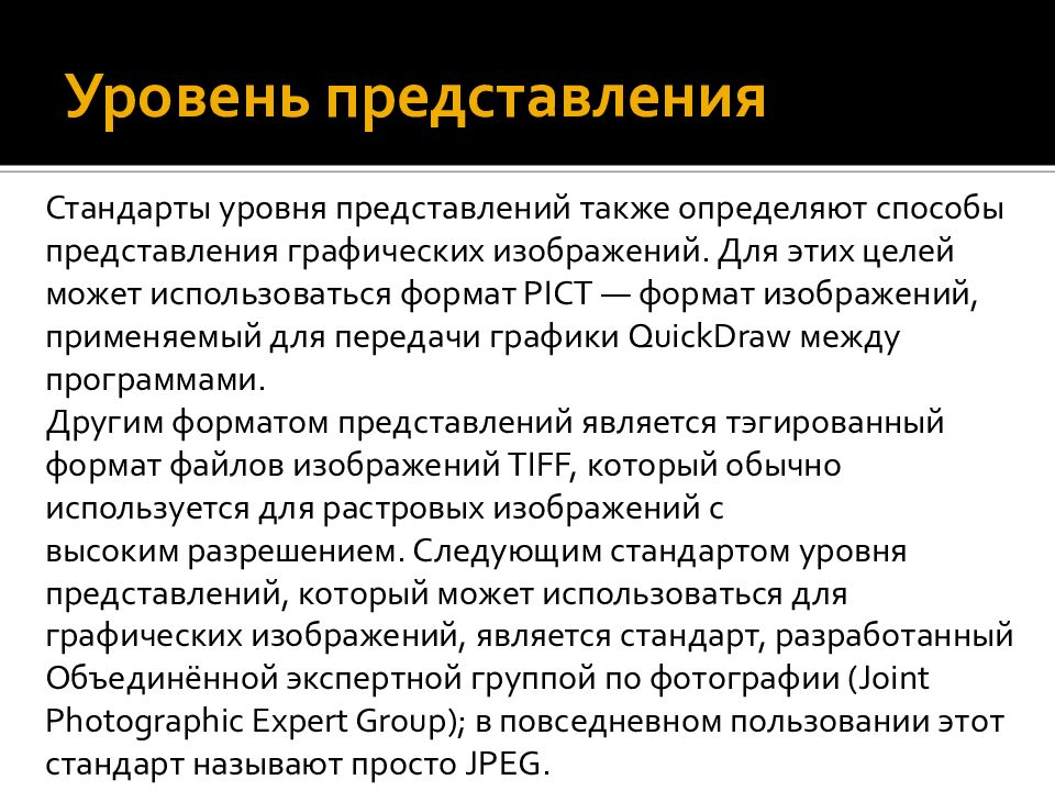 Стандарты уровня представлений также определяют способы представления графических изображений. Для этих целей может использоваться формат PICT — формат изображений, применяемый для передачи графики QuickDraw между программами. Другим форматом представлений является тэгированный формат файлов изображений TIFF, который обычно используется для растровых изображений с высоким разрешением. Следующим стандартом уровня представлений, который может использоваться для графических изображений, является стандарт, разработанный Объединённой экспертной группой по фотографии ( Joint Photographic Expert Group ); в повседневном пользовании этот стандарт называют просто JPEG.