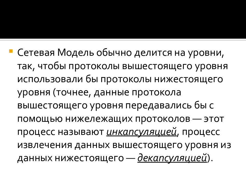 Сетевая Модель обычно делится на уровни, так, чтобы протоколы вышестоящего уровня использовали бы протоколы нижестоящего уровня (точнее, данные протокола вышестоящего уровня передавались бы с помощью нижележащих протоколов — этот процесс называют инкапсуляцией, процесс извлечения данных вышестоящего уровня из данных нижестоящего — декапсуляцией ).