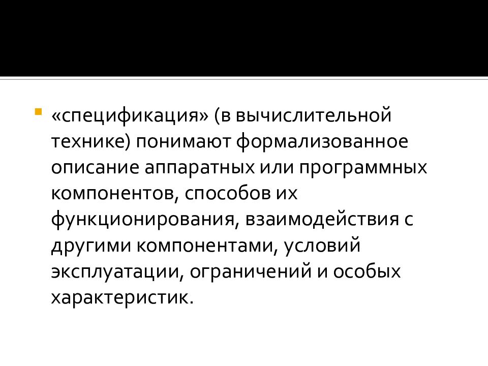 «спецификация» (в вычислительной технике) понимают формализованное описание аппаратных или программных компонентов, способов их функционирования, взаимодействия с другими компонентами, условий эксплуатации, ограничений и особых характеристик.