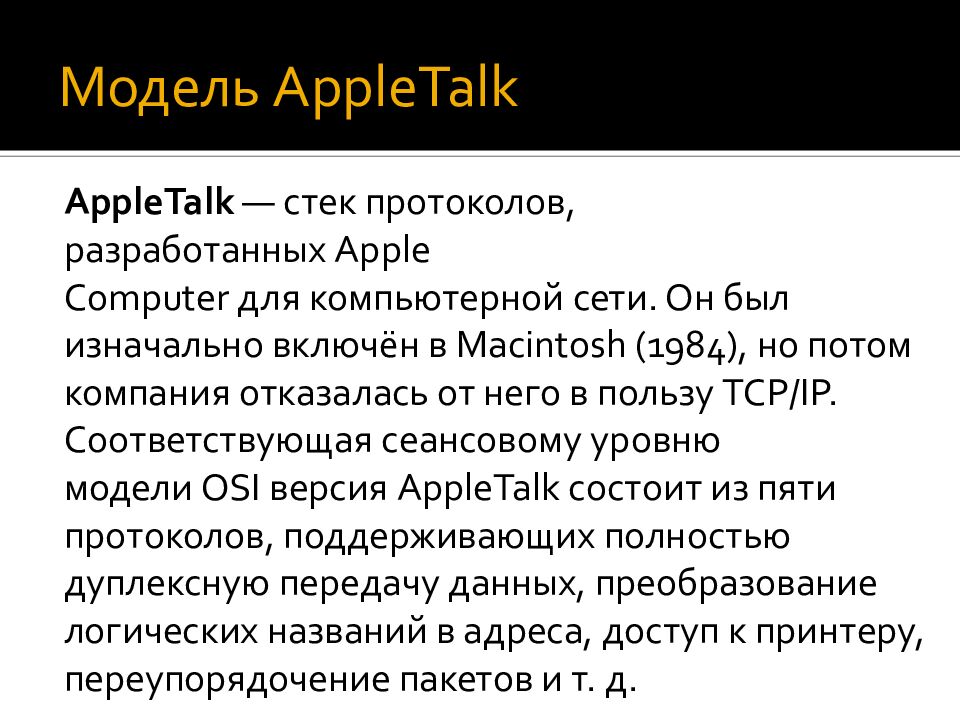 AppleTalk — стек протоколов, разработанных Apple Computer для компьютерной сети. Он был изначально включён в Macintosh (1984), но потом компания отказалась от него в пользу TCP/IP. Соответствующая сеансовому уровню модели OSI версия AppleTalk состоит из пяти протоколов, поддерживающих полностью дуплексную передачу данных, преобразование логических названий в адреса, доступ к принтеру, переупорядочение пакетов и т. д.