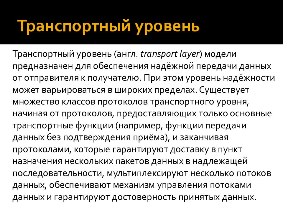 Транспортный уровень (англ. transport layer ) модели предназначен для обеспечения надёжной передачи данных от отправителя к получателю. При этом уровень надёжности может варьироваться в широких пределах. Существует множество классов протоколов транспортного уровня, начиная от протоколов, предоставляющих только основные транспортные функции (например, функции передачи данных без подтверждения приёма), и заканчивая протоколами, которые гарантируют доставку в пункт назначения нескольких пакетов данных в надлежащей последовательности, мультиплексируют несколько потоков данных, обеспечивают механизм управления потоками данных и гарантируют достоверность принятых данных.