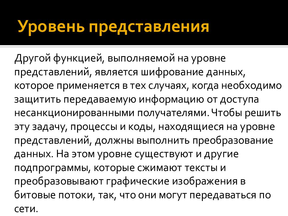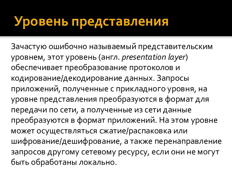 Зачастую ошибочно называемый представительским уровнем, этот уровень (англ. presentation layer ) обеспечивает преобразование протоколов и кодирование/декодирование данных. Запросы приложений, полученные с прикладного уровня, на уровне представления преобразуются в формат для передачи по сети, а полученные из сети данные преобразуются в формат приложений. На этом уровне может осуществляться сжатие/распаковка или шифрование/дешифрование, а также перенаправление запросов другому сетевому ресурсу, если они не могут быть обработаны локально.