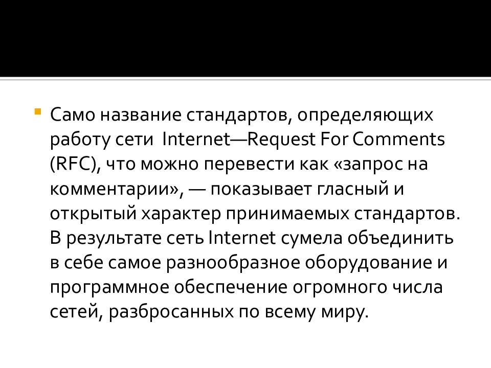 Само название стандартов, определяющих работу сети Internet — Request For Comments (RFC ), что можно перевести как «запрос на комментарии», — показывает гласный и открытый характер принимаемых стандартов. В результате сеть Internet сумела объединить в себе самое разнообразное оборудование и программное обеспечение огромного числа сетей, разбросанных по всему миру.