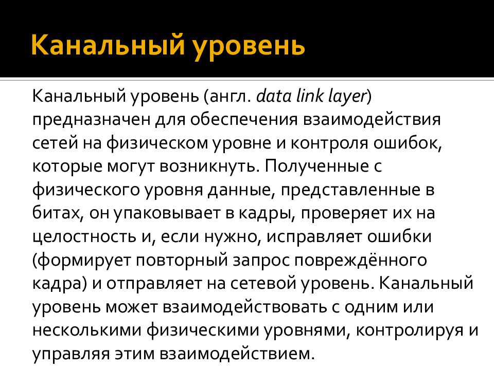 Канальный уровень (англ. data link layer ) предназначен для обеспечения взаимодействия сетей на физическом уровне и контроля ошибок, которые могут возникнуть. Полученные с физического уровня данные, представленные в битах, он упаковывает в кадры, проверяет их на целостность и, если нужно, исправляет ошибки (формирует повторный запрос повреждённого кадра) и отправляет на сетевой уровень. Канальный уровень может взаимодействовать с одним или несколькими физическими уровнями, контролируя и управляя этим взаимодействием.