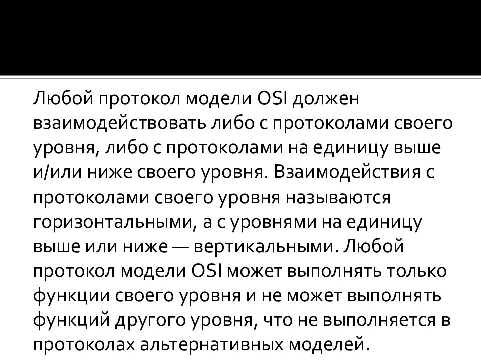 Любой протокол модели OSI должен взаимодействовать либо с протоколами своего уровня, либо с протоколами на единицу выше и/или ниже своего уровня. Взаимодействия с протоколами своего уровня называются горизонтальными, а с уровнями на единицу выше или ниже — вертикальными. Любой протокол модели OSI может выполнять только функции своего уровня и не может выполнять функций другого уровня, что не выполняется в протоколах альтернативных моделей.