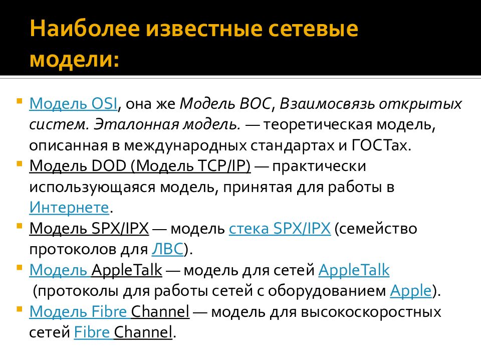 Модель OSI, она же Модель ВОС, Взаимосвязь открытых систем. Эталонная модель. — теоретическая модель, описанная в международных стандартах и ГОСТах. Модель DOD (Модель TCP/IP) — практически использующаяся модель, принятая для работы в Интернете. Модель SPX/IPX — модель стека SPX/IPX (семейство протоколов для ЛВС ). Модель AppleTalk — модель для сетей AppleTalk (протоколы для работы сетей с оборудованием Apple ). Модель Fibre Channel — модель для высокоскоростных сетей Fibre Channel.
