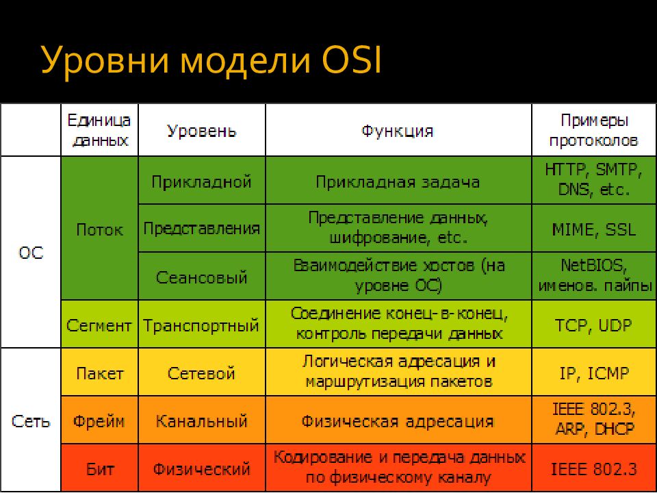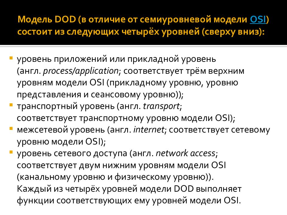 уровень приложений или прикладной уровень (англ. process / application ; соответствует трём верхним уровням модели OSI (прикладному уровню, уровню представления и сеансовому уровню)); транспортный уровень (англ. transport ; соответствует транспортному уровню модели OSI); межсетевой уровень (англ. internet ; соответствует сетевому уровню модели OSI); уровень сетевого доступа (англ. network access ; соответствует двум нижним уровням модели OSI (канальному уровню и физическому уровню)). Каждый из четырёх уровней модели DOD выполняет функции соответствующих ему уровней модели OSI.