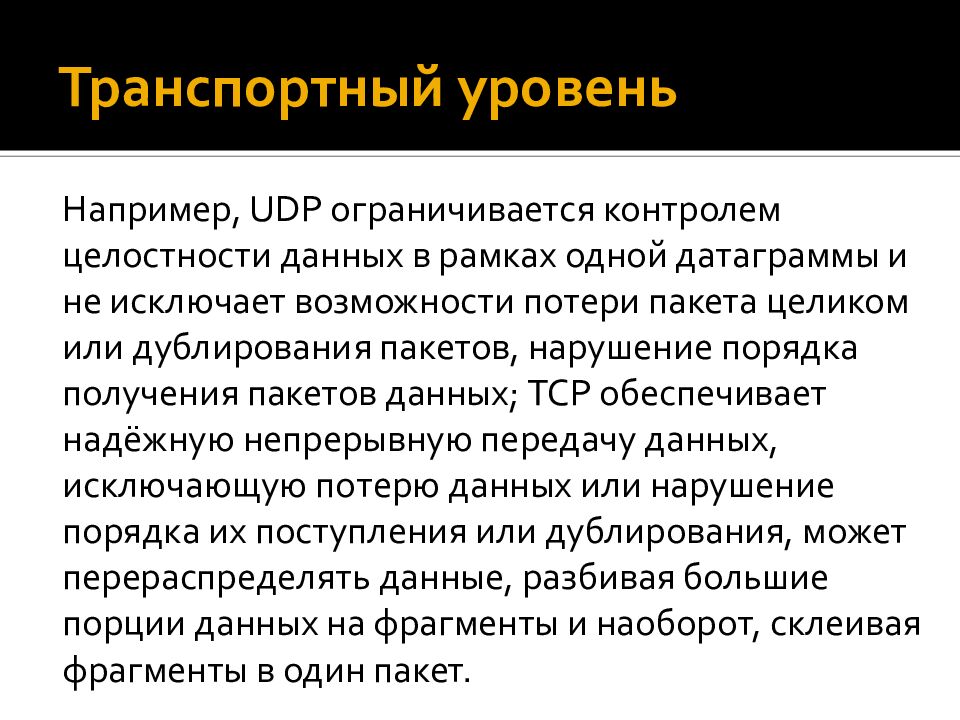 Например, UDP ограничивается контролем целостности данных в рамках одной датаграммы и не исключает возможности потери пакета целиком или дублирования пакетов, нарушение порядка получения пакетов данных; TCP обеспечивает надёжную непрерывную передачу данных, исключающую потерю данных или нарушение порядка их поступления или дублирования, может перераспределять данные, разбивая большие порции данных на фрагменты и наоборот, склеивая фрагменты в один пакет.