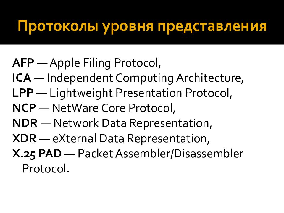 AFP — Apple Filing Protocol, ICA — Independent Computing Architecture, LPP — Lightweight Presentation Protocol, NCP — NetWare Core Protocol, NDR — Network Data Representation, XDR — eXternal Data Representation, X.25 PAD — Packet Assembler/ Disassembler Protocol.