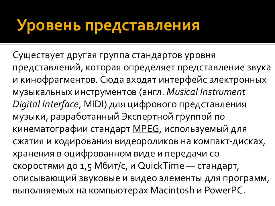 Существует другая группа стандартов уровня представлений, которая определяет представление звука и кинофрагментов. Сюда входят интерфейс электронных музыкальных инструментов (англ. Musical Instrument Digital Interface, MIDI) для цифрового представления музыки, разработанный Экспертной группой по кинематографии стандарт MPEG, используемый для сжатия и кодирования видеороликов на компакт-дисках, хранения в оцифрованном виде и передачи со скоростями до 1,5 Мбит/с, и QuickTime — стандарт, описывающий звуковые и видео элементы для программ, выполняемых на компьютерах Macintosh и PowerPC.