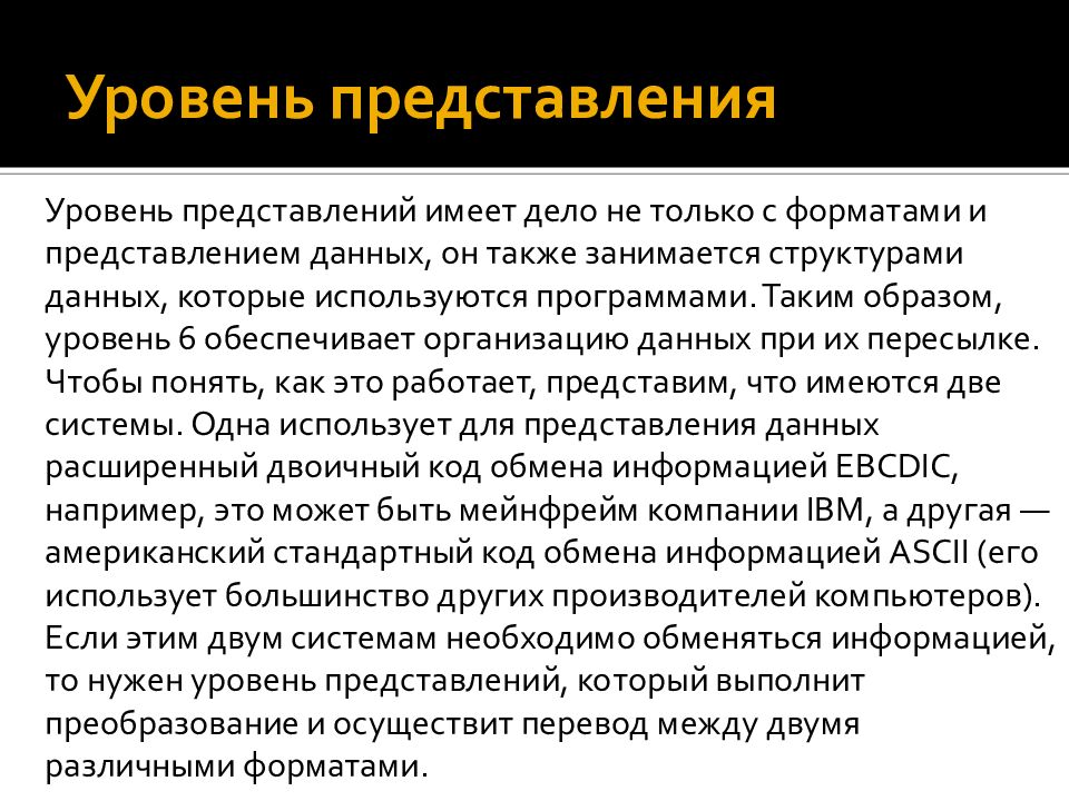 Уровень представлений имеет дело не только с форматами и представлением данных, он также занимается структурами данных, которые используются программами. Таким образом, уровень 6 обеспечивает организацию данных при их пересылке. Чтобы понять, как это работает, представим, что имеются две системы. Одна использует для представления данных расширенный двоичный код обмена информацией EBCDIC, например, это может быть мейнфрейм компании IBM, а другая — американский стандартный код обмена информацией ASCII (его использует большинство других производителей компьютеров). Если этим двум системам необходимо обменяться информацией, то нужен уровень представлений, который выполнит преобразование и осуществит перевод между двумя различными форматами.