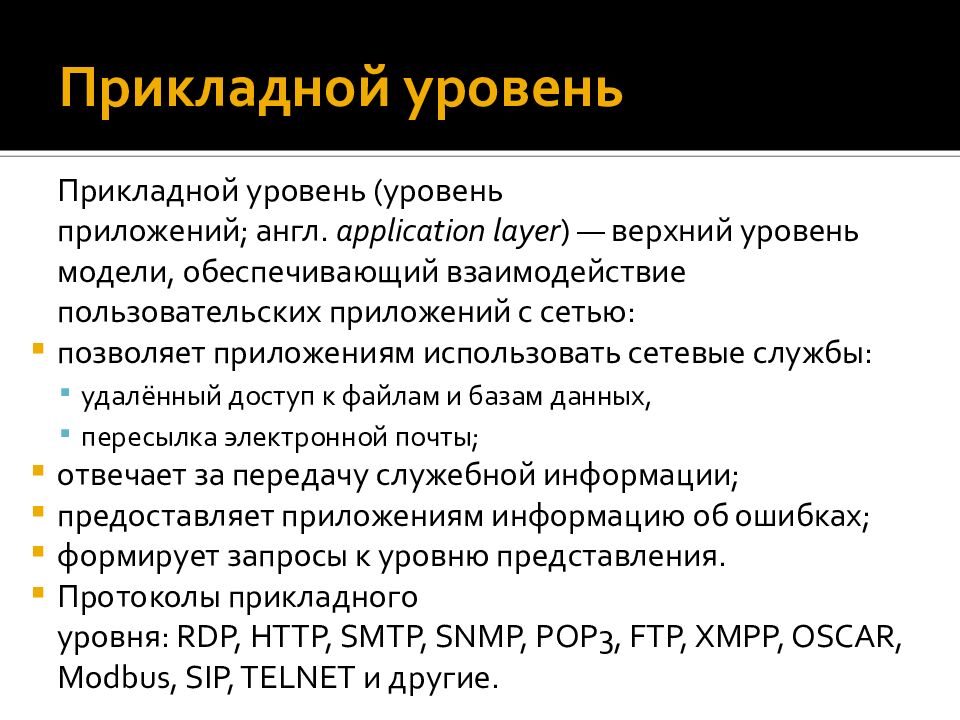 Прикладной уровень ( уровень приложений; англ. application layer ) — верхний уровень модели, обеспечивающий взаимодействие пользовательских приложений с сетью: позволяет приложениям использовать сетевые службы: удалённый доступ к файлам и базам данных, пересылка электронной почты; отвечает за передачу служебной информации; предоставляет приложениям информацию об ошибках; формирует запросы к уровню представления. Протоколы прикладного уровня: RDP, HTTP, SMTP, SNMP, POP3, FTP, XMPP, OSCAR, Modbus, SIP, TELNET и другие.