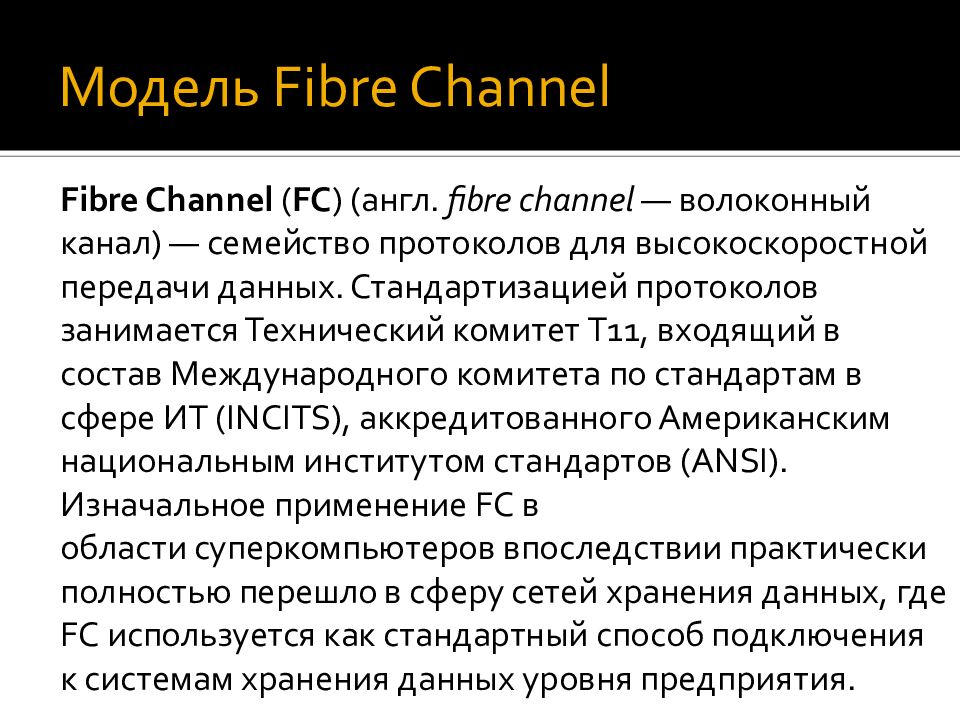 Fibre Channel ( FC ) (англ. fibre channel — волоконный канал) — семейство протоколов для высокоскоростной передачи данных. Стандартизацией протоколов занимается Технический комитет T11, входящий в состав Международного комитета по стандартам в сфере ИТ (INCITS), аккредитованного Американским национальным институтом стандартов (ANSI). Изначальное применение FC в области суперкомпьютеров впоследствии практически полностью перешло в сферу сетей хранения данных, где FC используется как стандартный способ подключения к системам хранения данных уровня предприятия.