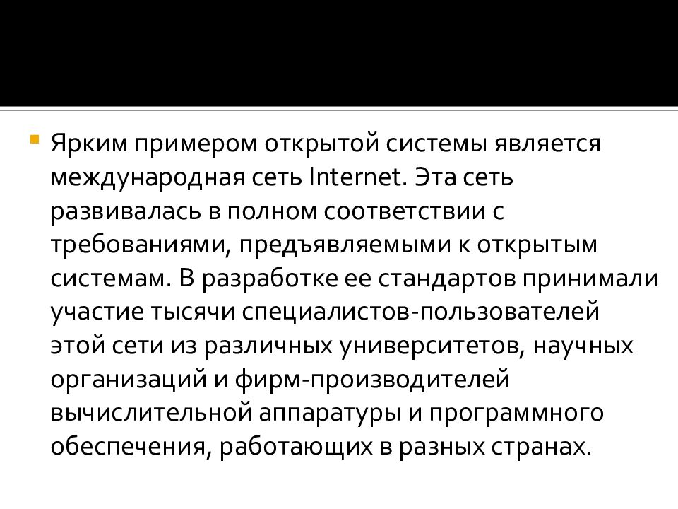 Ярким примером открытой системы является международная сеть Internet. Эта сеть развивалась в полном соответствии с требованиями, предъявляемыми к открытым системам. В разработке ее стандартов принимали участие тысячи специалистов-пользователей этой сети из различных университетов, научных организаций и фирм-производителей вычислительной аппаратуры и программного обеспечения, работающих в разных странах.