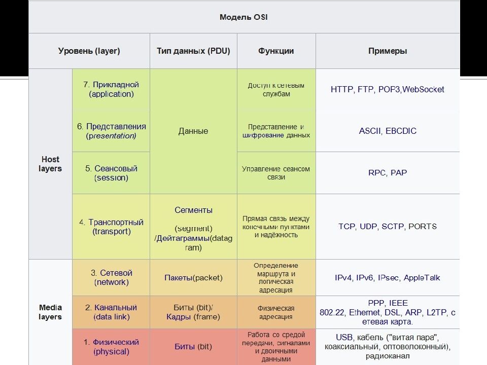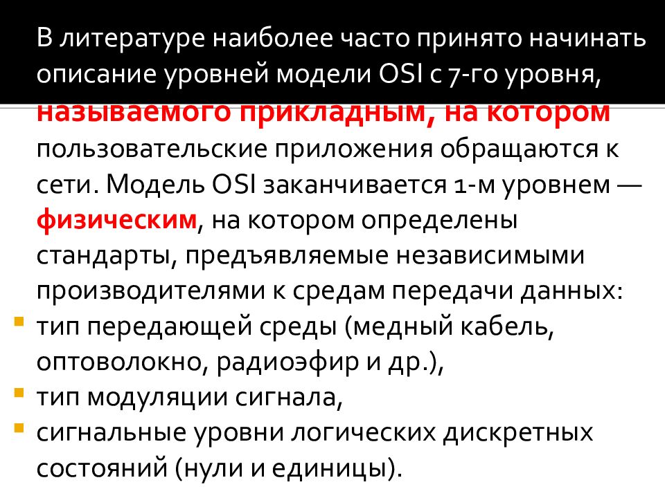 В литературе наиболее часто принято начинать описание уровней модели OSI с 7-го уровня, называемого прикладным, на котором пользовательские приложения обращаются к сети. Модель OSI заканчивается 1-м уровнем — физическим, на котором определены стандарты, предъявляемые независимыми производителями к средам передачи данных: тип передающей среды (медный кабель, оптоволокно, радиоэфир и др.), тип модуляции сигнала, сигнальные уровни логических дискретных состояний (нули и единицы).