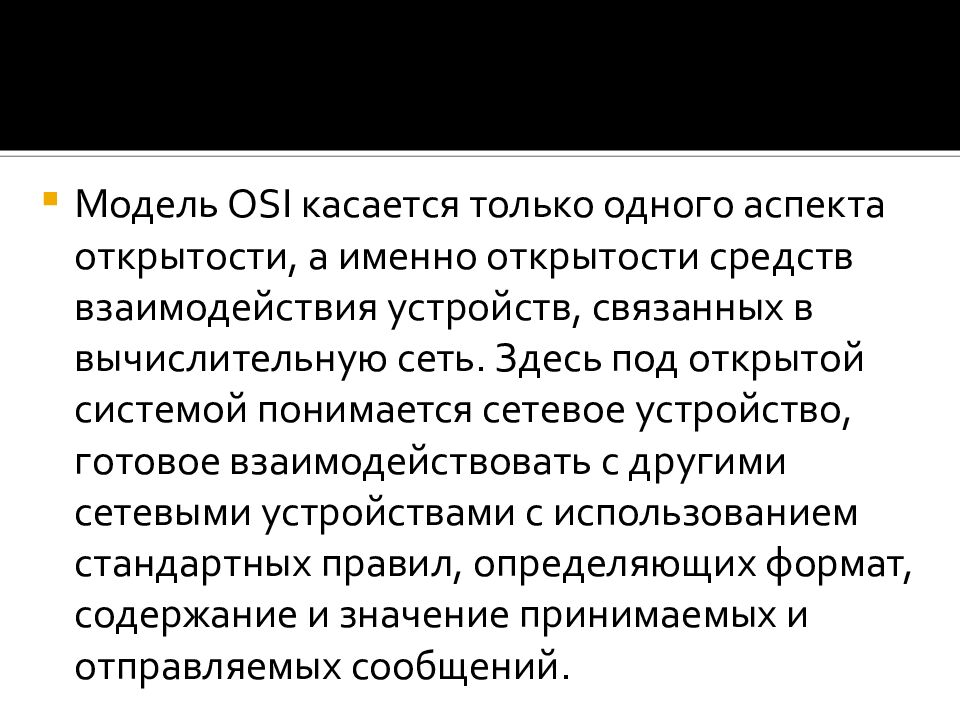 Модель OSI касается только одного аспекта открытости, а именно открытости средств взаимодействия устройств, связанных в вычислительную сеть. Здесь под открытой системой понимается сетевое устройство, готовое взаимодействовать с другими сетевыми устройствами с использованием стандартных правил, определяющих формат, содержание и значение принимаемых и отправляемых сообщений.