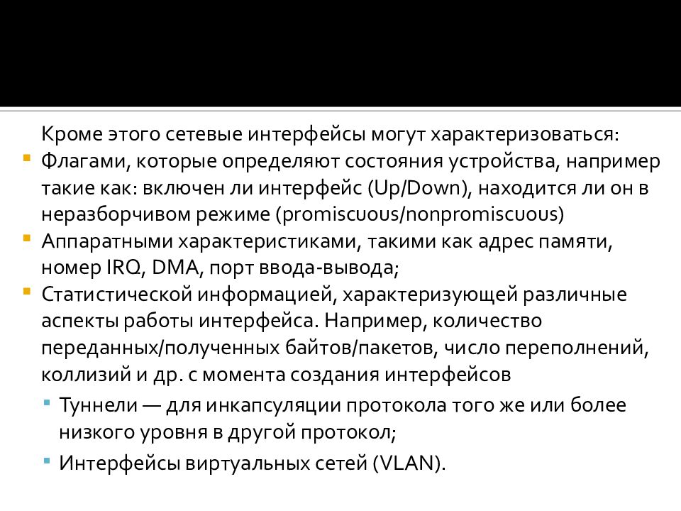 Кроме этого сетевые интерфейсы могут характеризоваться: Флагами, которые определяют состояния устройства, например такие как: включен ли интерфейс ( Up / Down ), находится ли он в неразборчивом режиме ( promiscuous / nonpromiscuous ) Аппаратными характеристиками, такими как адрес памяти, номер IRQ, DMA, порт ввода-вывода; Статистической информацией, характеризующей различные аспекты работы интерфейса. Например, количество переданных/полученных байтов/пакетов, число переполнений, коллизий и др. с момента создания интерфейсов Туннели — для инкапсуляции протокола того же или более низкого уровня в другой протокол; Интерфейсы виртуальных сетей (VLAN).