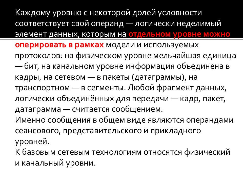Каждому уровню с некоторой долей условности соответствует свой операнд — логически неделимый элемент данных, которым на отдельном уровне можно оперировать в рамках модели и используемых протоколов: на физическом уровне мельчайшая единица — бит, на канальном уровне информация объединена в кадры, на сетевом — в пакеты ( датаграммы ), на транспортном — в сегменты. Любой фрагмент данных, логически объединённых для передачи — кадр, пакет, датаграмма — считается сообщением. Именно сообщения в общем виде являются операндами сеансового, представительского и прикладного уровней. К базовым сетевым технологиям относятся физический и канальный уровни.