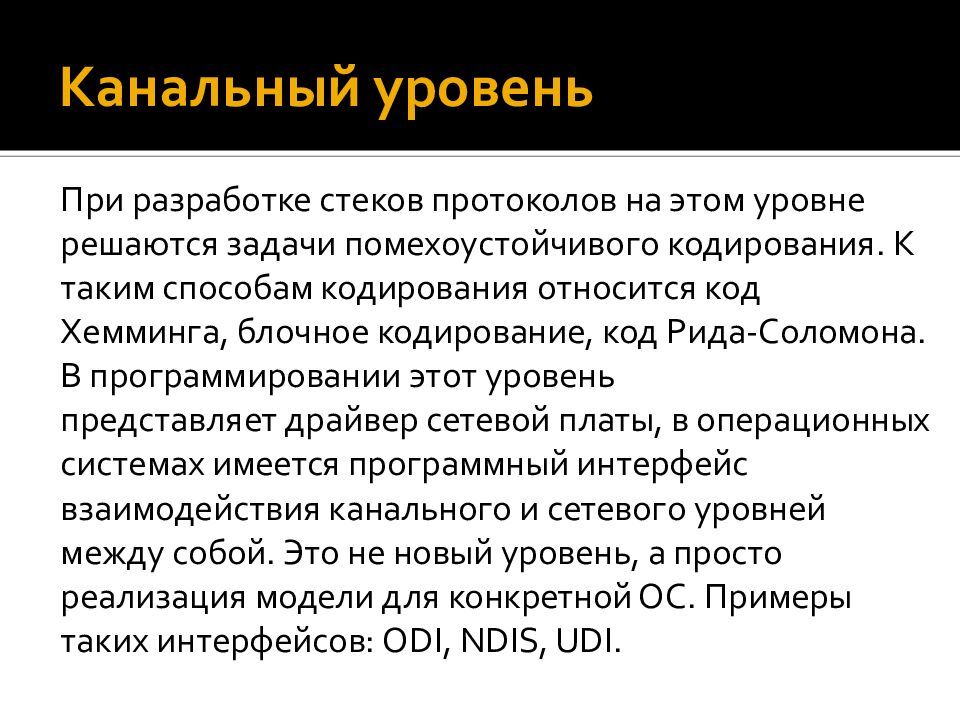 При разработке стеков протоколов на этом уровне решаются задачи помехоустойчивого кодирования. К таким способам кодирования относится код Хемминга, блочное кодирование, код Рида-Соломона. В программировании этот уровень представляет драйвер сетевой платы, в операционных системах имеется программный интерфейс взаимодействия канального и сетевого уровней между собой. Это не новый уровень, а просто реализация модели для конкретной ОС. Примеры таких интерфейсов: ODI, NDIS, UDI.