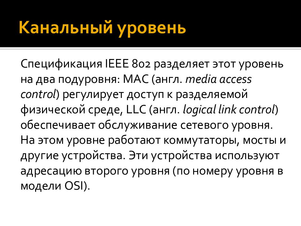 Спецификация IEEE 802 разделяет этот уровень на два подуровня: MAC (англ. media access control ) регулирует доступ к разделяемой физической среде, LLC (англ. logical link control ) обеспечивает обслуживание сетевого уровня. На этом уровне работают коммутаторы, мосты и другие устройства. Эти устройства используют адресацию второго уровня (по номеру уровня в модели OSI).