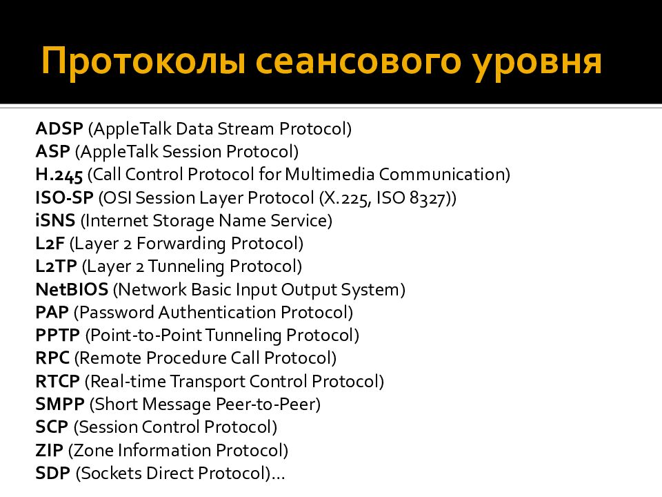 ADSP (AppleTalk Data Stream Protocol) ASP (AppleTalk Session Protocol) H.245 (Call Control Protocol for Multimedia Communication) ISO-SP (OSI Session Layer Protocol (X.225, ISO 8327)) iSNS (Internet Storage Name Service) L2F (Layer 2 Forwarding Protocol) L2TP (Layer 2 Tunneling Protocol) NetBIOS (Network Basic Input Output System) PAP (Password Authentication Protocol) PPTP (Point-to-Point Tunneling Protocol) RPC (Remote Procedure Call Protocol) RTCP (Real-time Transport Control Protocol) SMPP (Short Message Peer-to-Peer) SCP (Session Control Protocol) ZIP (Zone Information Protocol) SDP (Sockets Direct Protocol)...