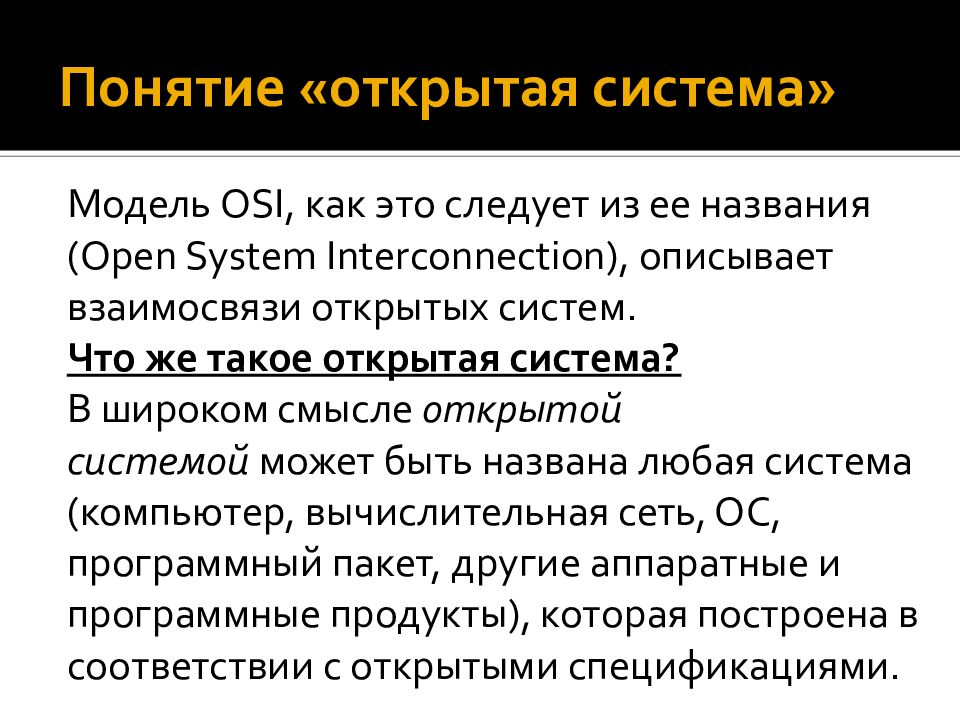 Модель OSI, как это следует из ее названия ( Open System Interconnection ), описывает взаимосвязи открытых систем. Что же такое открытая система? В широком смысле открытой системой может быть названа любая система (компьютер, вычислительная сеть, ОС, программный пакет, другие аппаратные и программные продукты), которая построена в соответствии с открытыми спецификациями.
