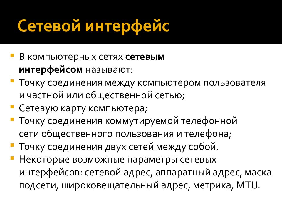 В компьютерных сетях сетевым интерфейсом называют: Точку соединения между компьютером пользователя и частной или общественной сетью; Сетевую карту компьютера; Точку соединения коммутируемой телефонной сети общественного пользования и телефона; Точку соединения двух сетей между собой. Некоторые возможные параметры сетевых интерфейсов: сетевой адрес, аппаратный адрес, маска подсети, широковещательный адрес, метрика, MTU.